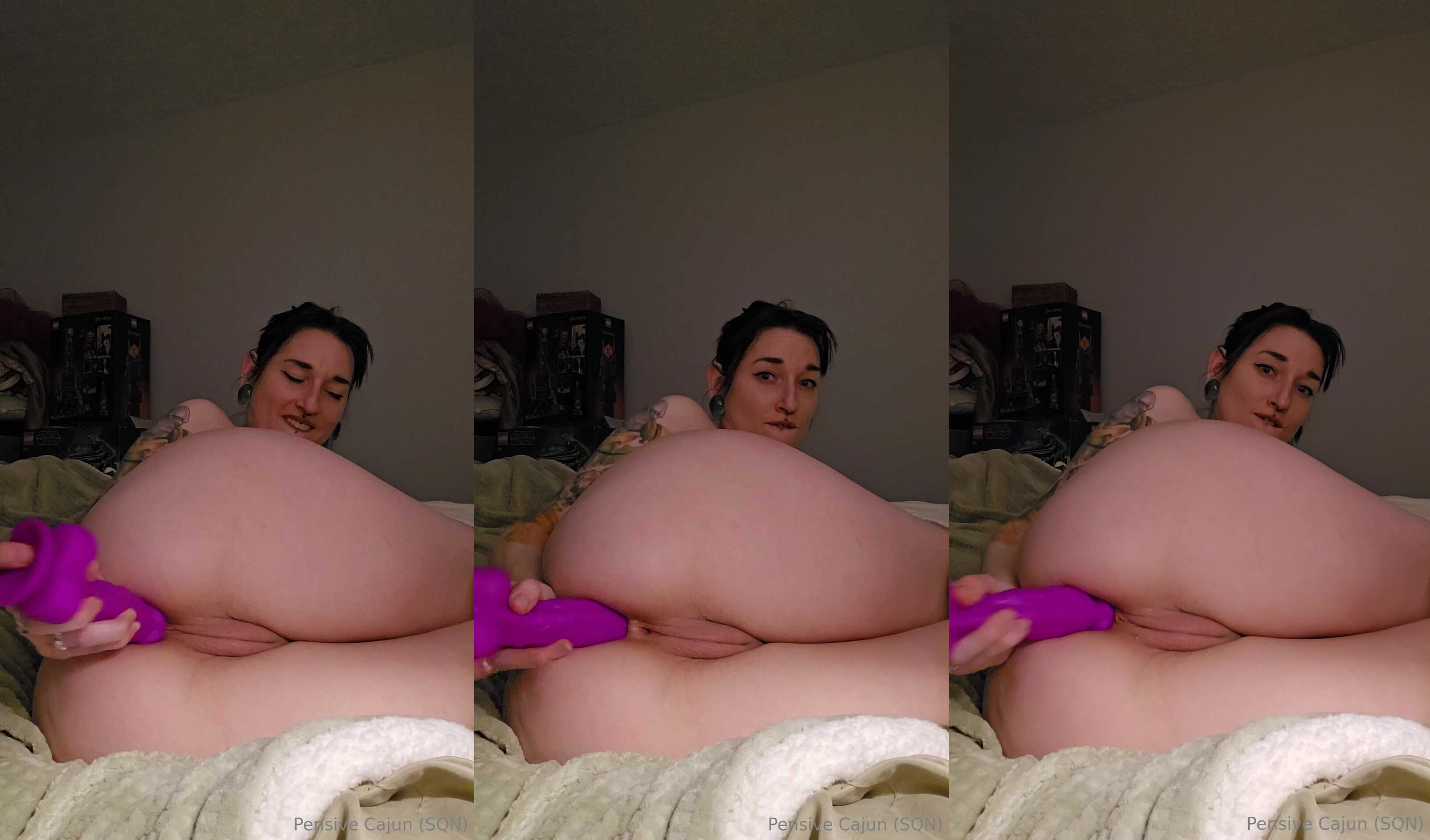 Description: In this exclusive clip, a voluptuous woman indulges in solo pleasure on a cozy bed. She teases with a vibrant purple toy, her large breasts on full display as she lies back, lost in the moment. Watch her every move as she enjoys her intimate time, capturing the raw essence of self-love.