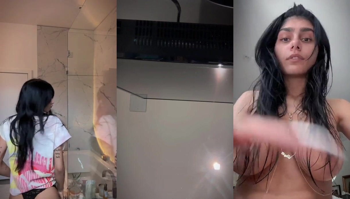 Mia Khalifa brings the heat in the kitchen while showing her massive tits in an oversized T-shirt in an OnlyFans video.