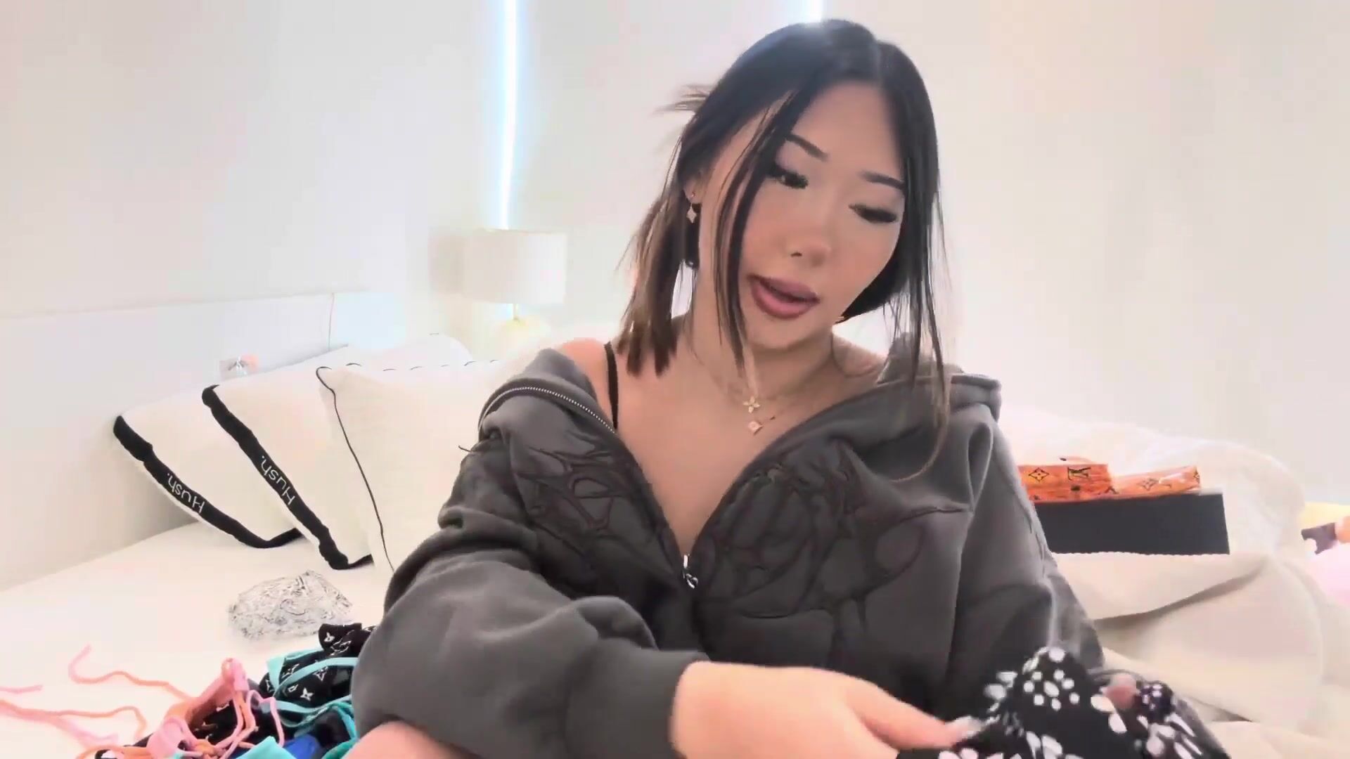 Asian babe Emma Lvxx models her favorite bikinis in a sexy bedroom video showcasing her curves and tight body.
