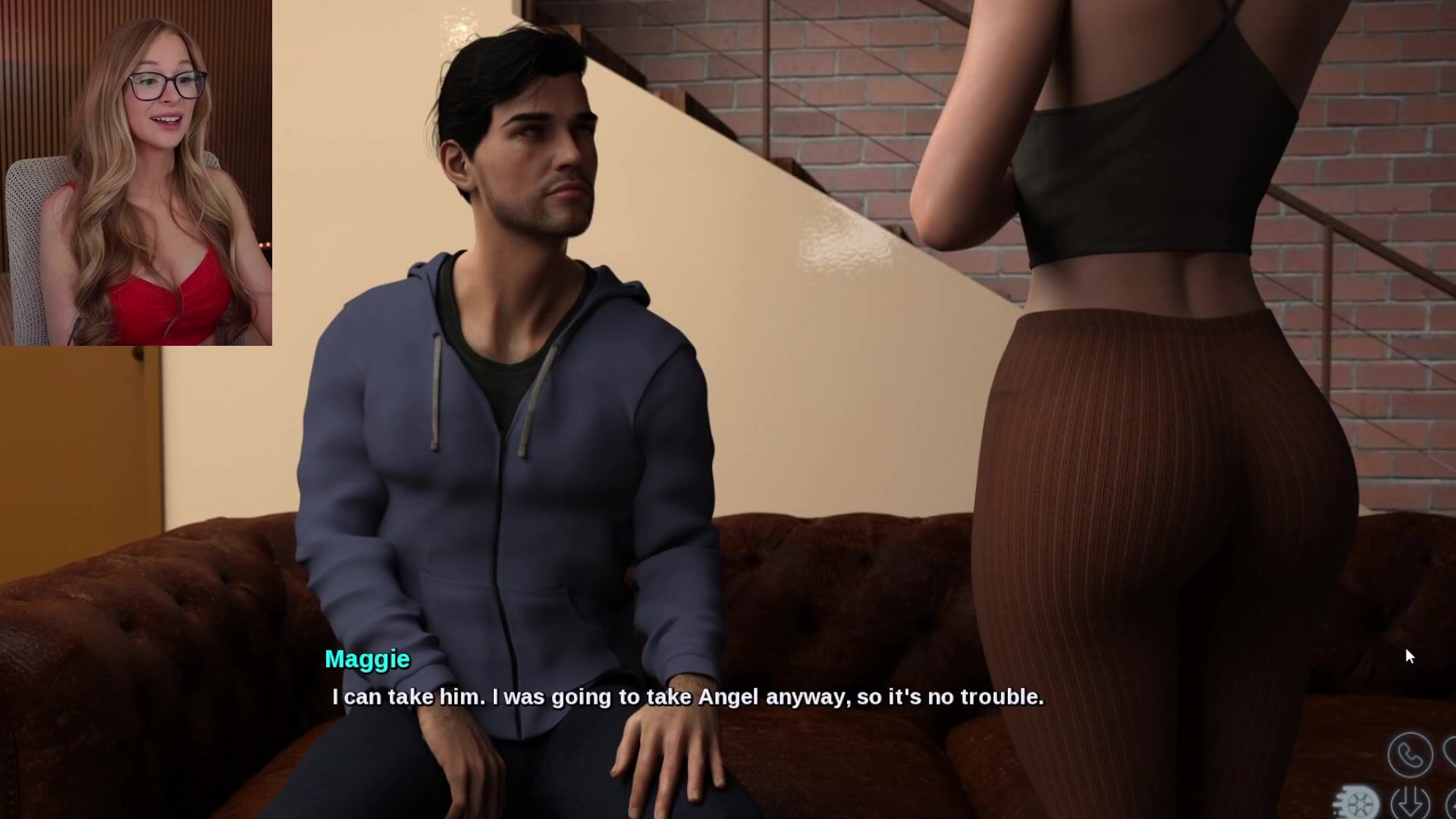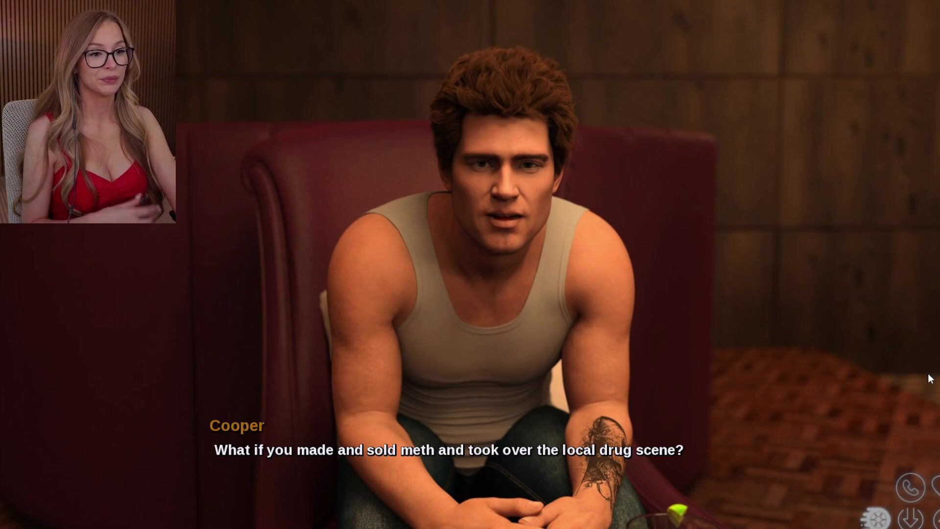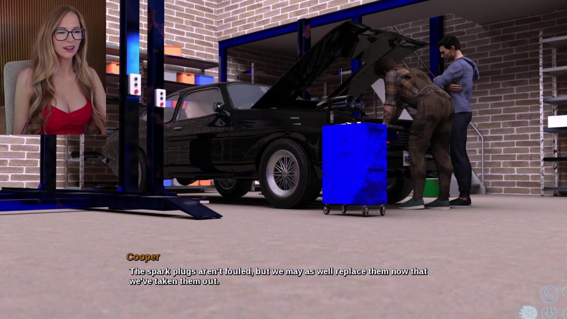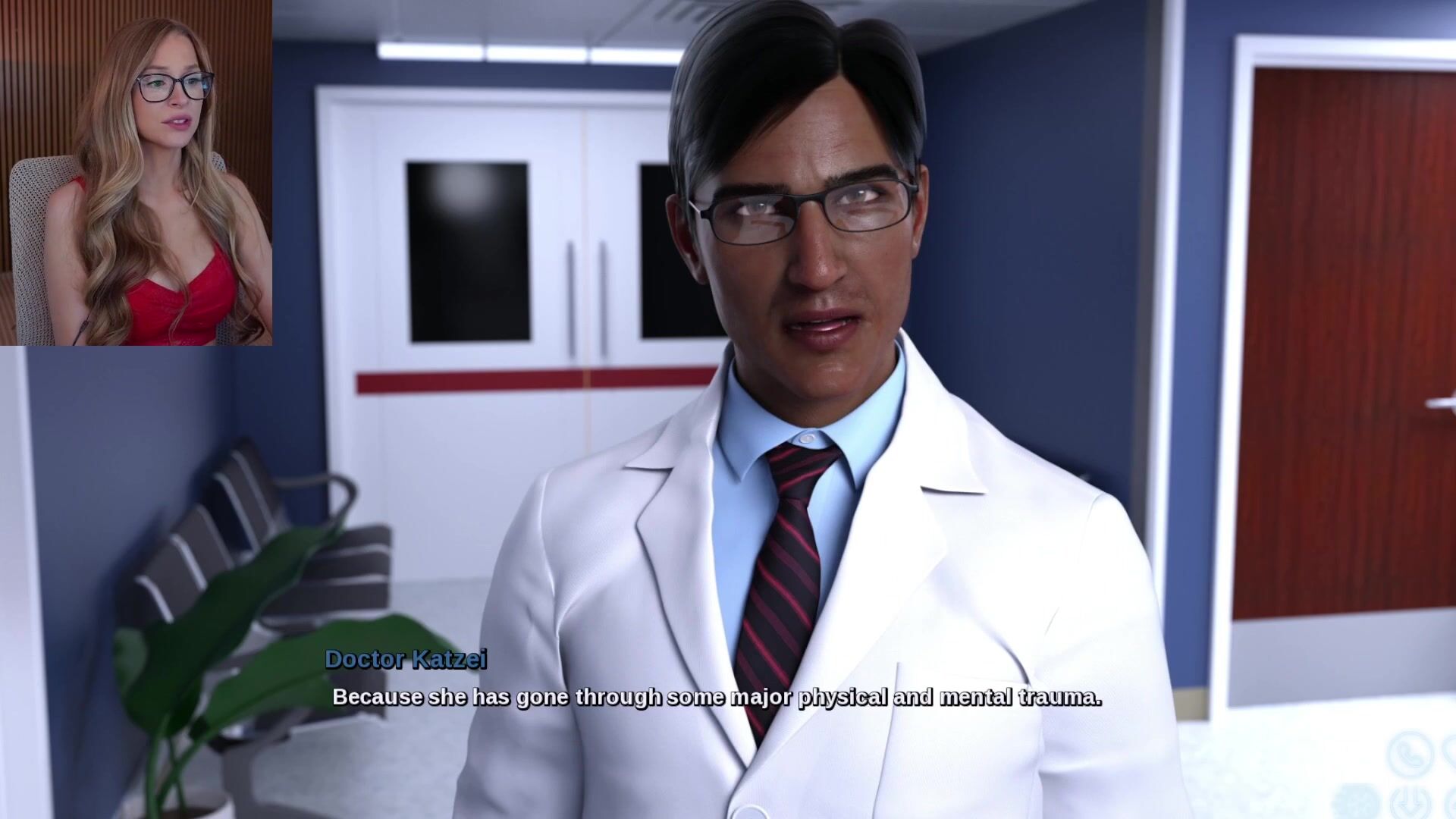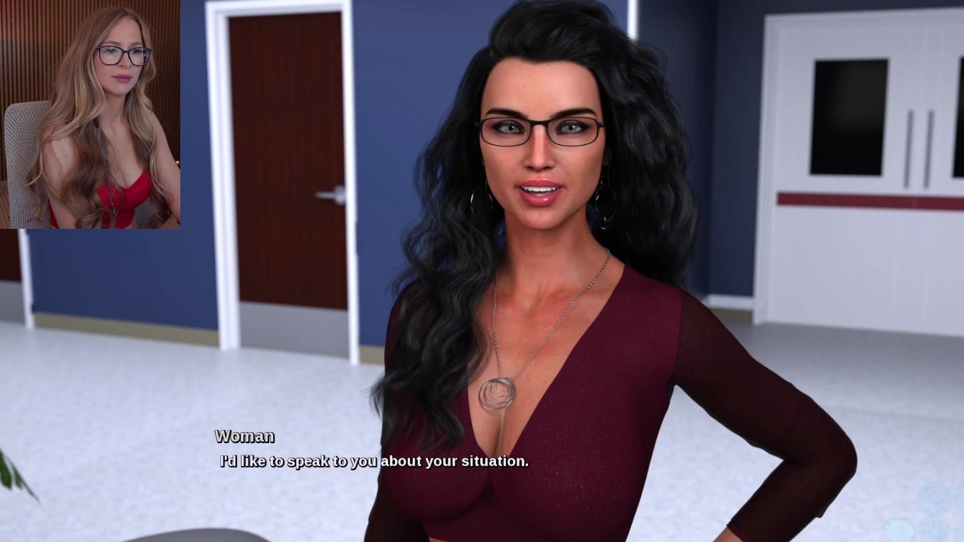 Sexy interactive video where petite cutie in red lingerie navigates intense sex scenes with multiple men across various settings.