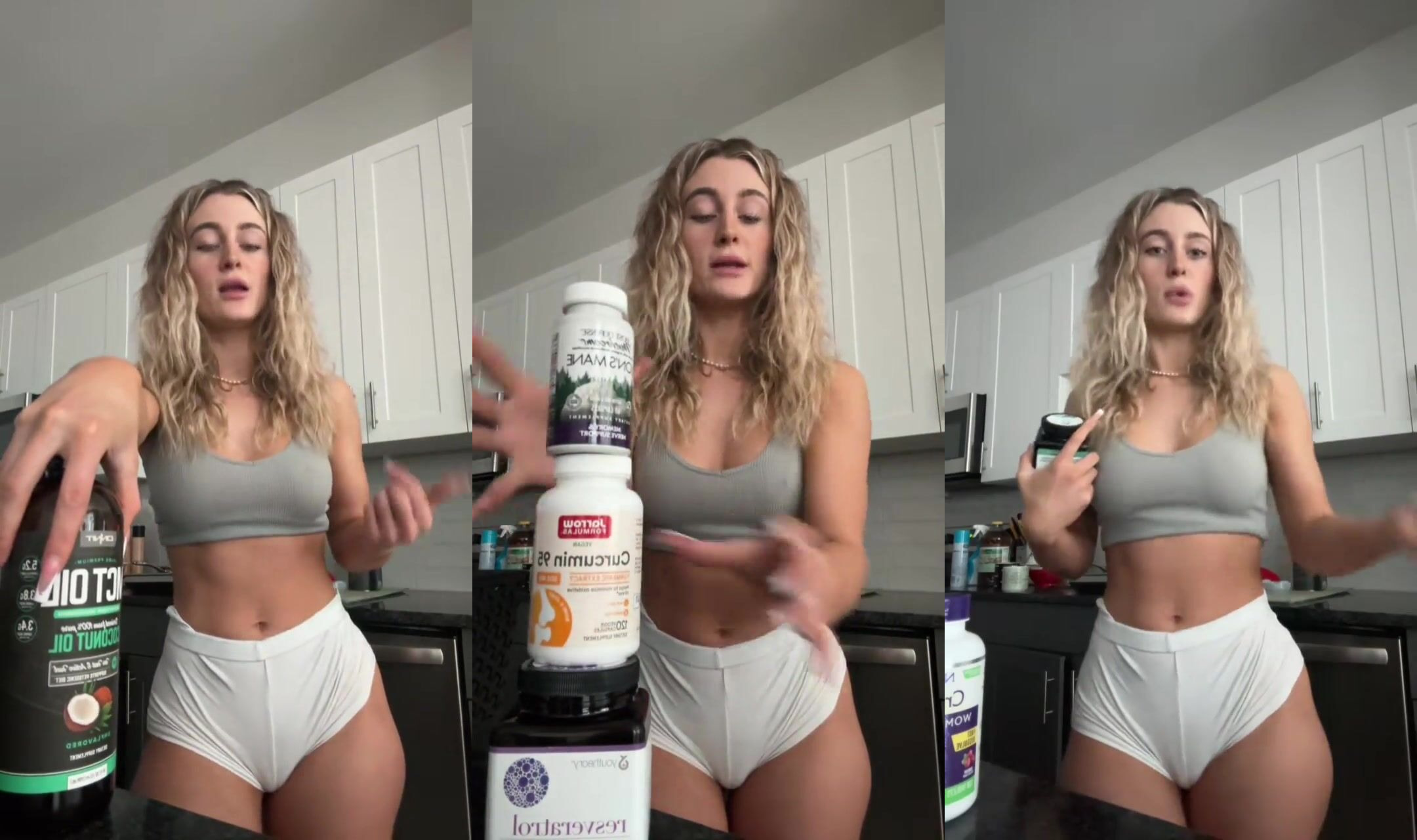 Abby Sexy IG Model gets playful in the kitchen wearing a tight crop top and white panties in this video.